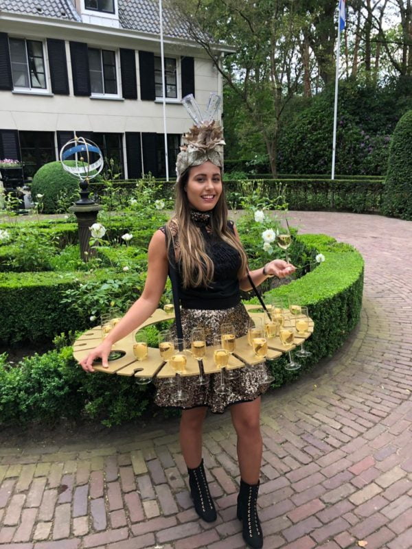 In overleg met de klant en met onze styliste is het Champagnemeisje perfect gekleed in de sfeer van het event.